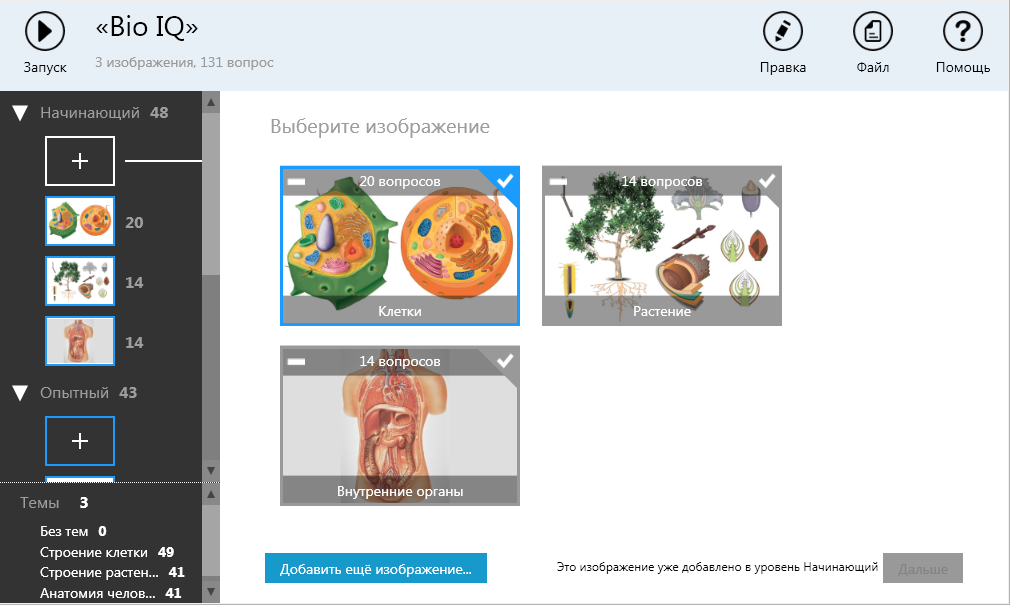 Продукт содержит многоуровневую игру-викторину по Биологии. В ней собраны вопросы по строению клетки, растениям и анатомии человека. Вопросы распределены по трём уровням сложности — «Начинающий», «Опытный» и «Профессионал».