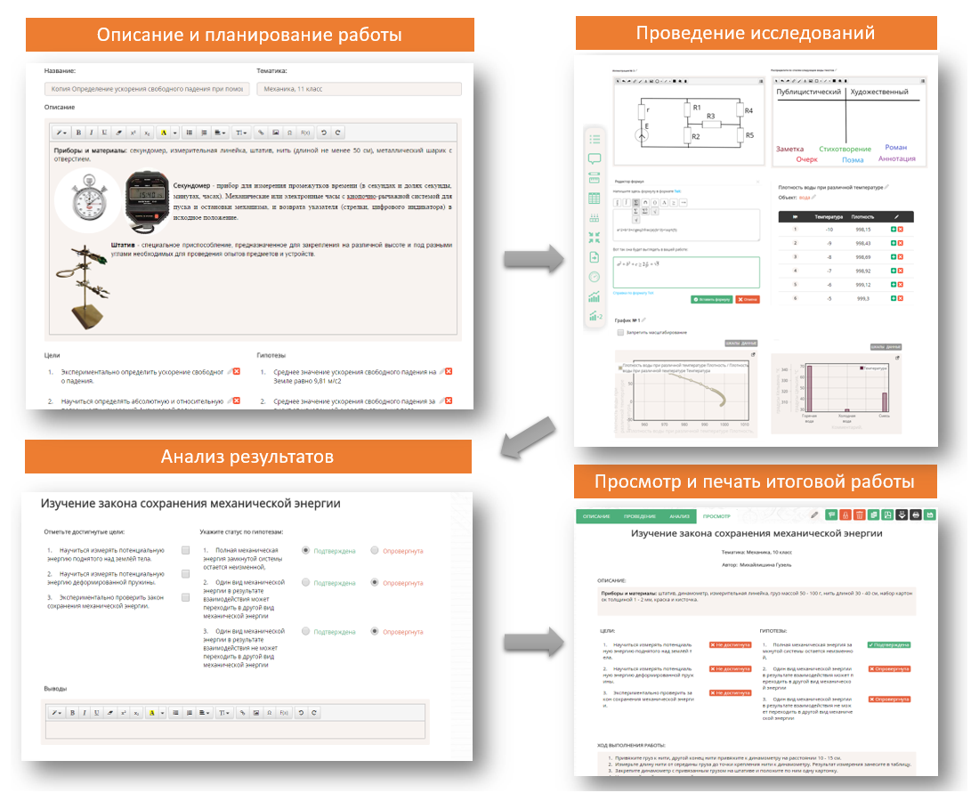 - обеспечивать поэтапное выполнение исследовательской работы в соответствии со следующей структурой разделов: «Описание», «Проведение», «Анализ», «Просмотр»;