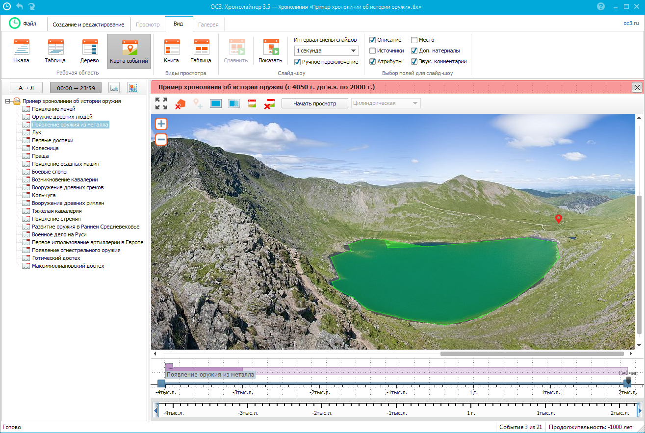ОС3. Хронолайнер позволяет работать с временными промежутками от секунд до миллионов лет: лента времени быстро и наглядно меняет масштаб, поэтому на ней легко отображаются как события одного дня или урока, так и события исторического масштаба, расстояние между которыми — столетия.
