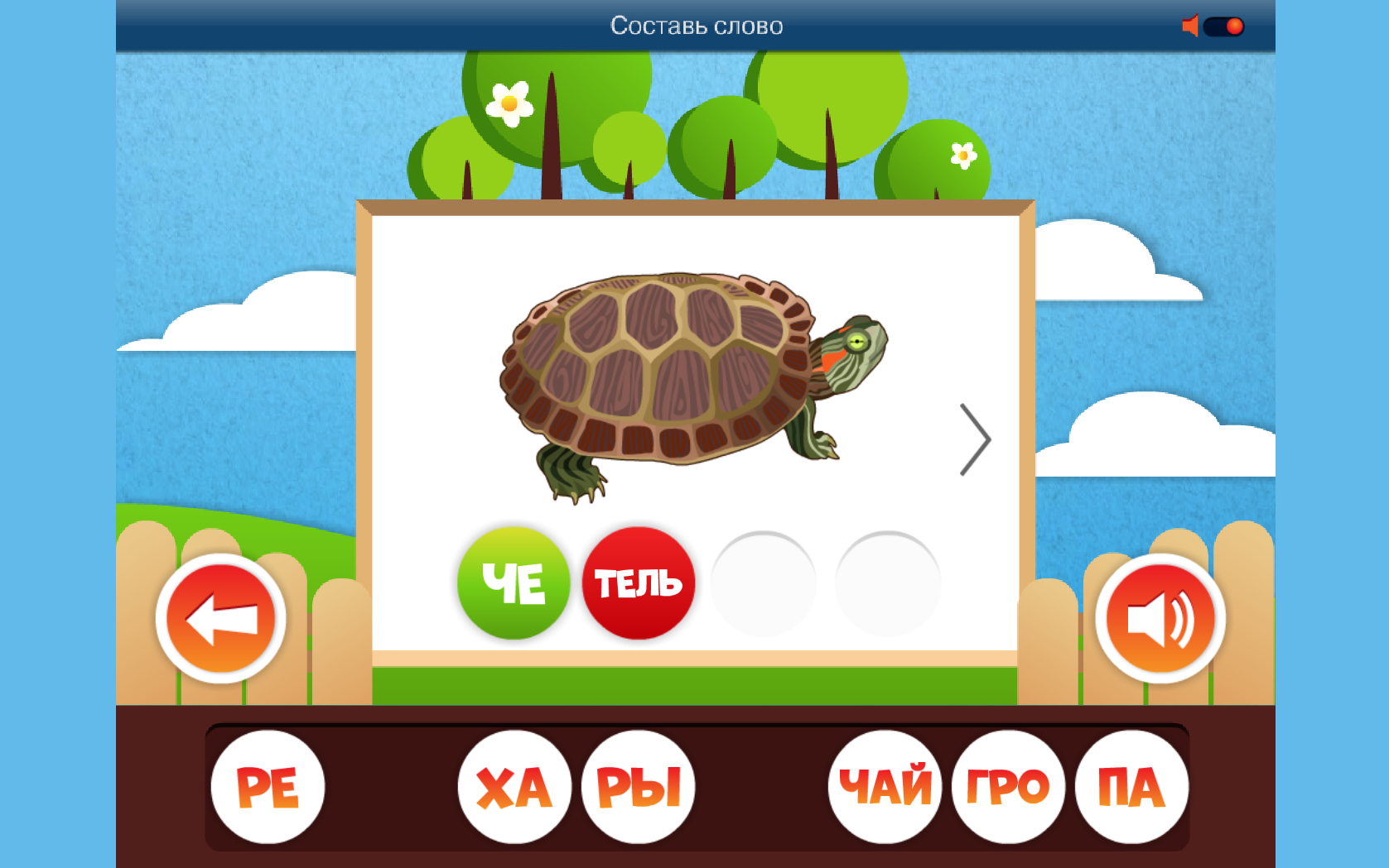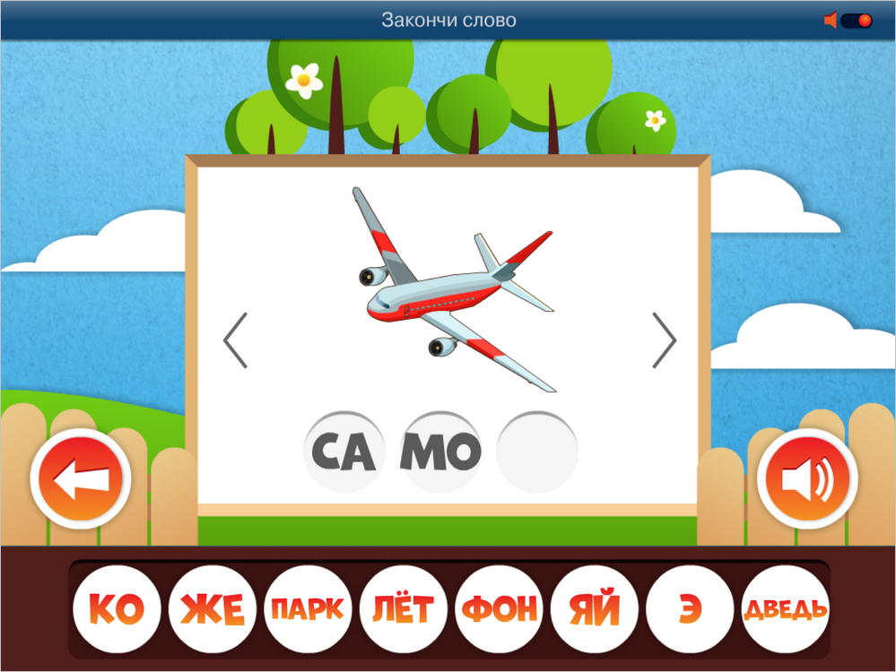 При проверке полученных знаний пользователю предлагается картинка, под ней написано название предмета, разбитое на слоги. Вместо последнего слога — пустое место. Ниже — случайный набор карточек слогов, включая правильный. Пользователь должен подобрать недостающий слог, нажимая на карточки.